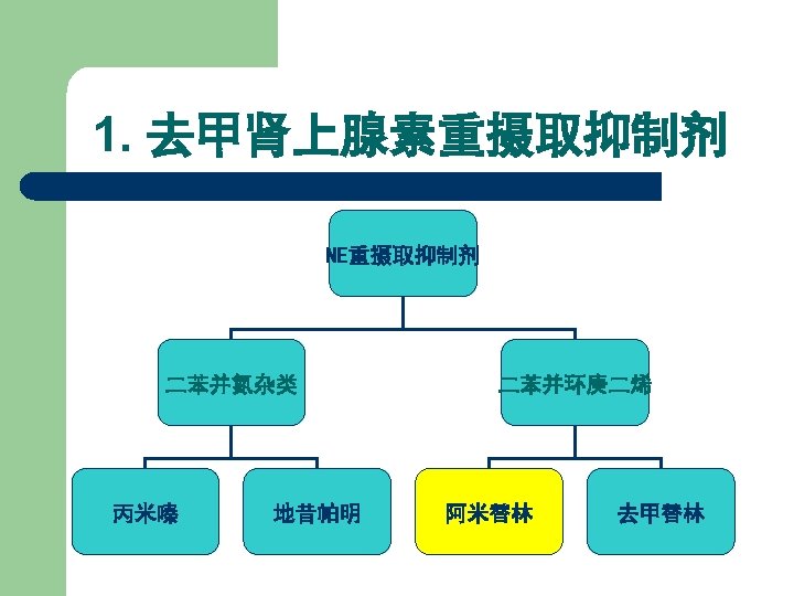 抗抑郁药 Antidepressant drugs 1. 去甲肾上腺素重摄取抑制剂 Norepinephrine-reuptake inhibitors 2. 5 -羟色胺重摄取抑制剂 Serotonin-reuptake inhibitors 3. 单胺氧化酶抑制剂 Monoamine oxidase inhibitors 4. 非典型的抗抑郁药 Atypical antidepressants