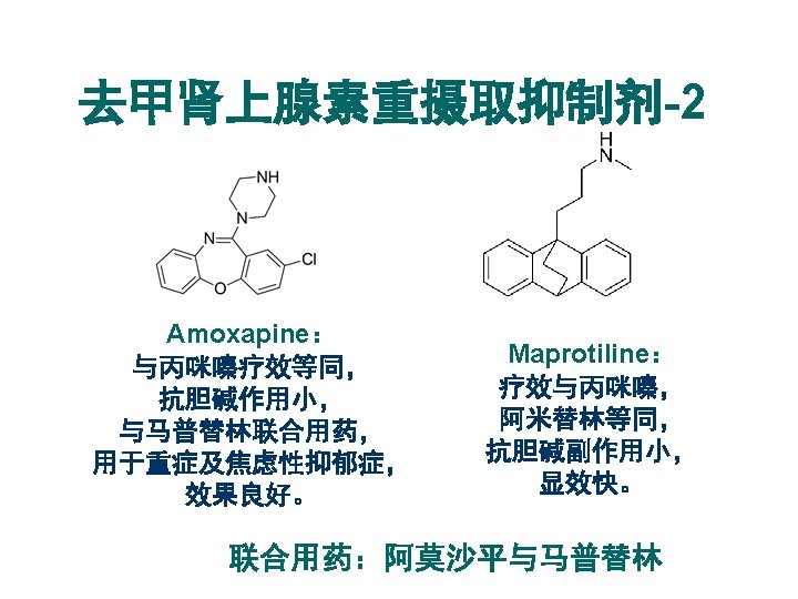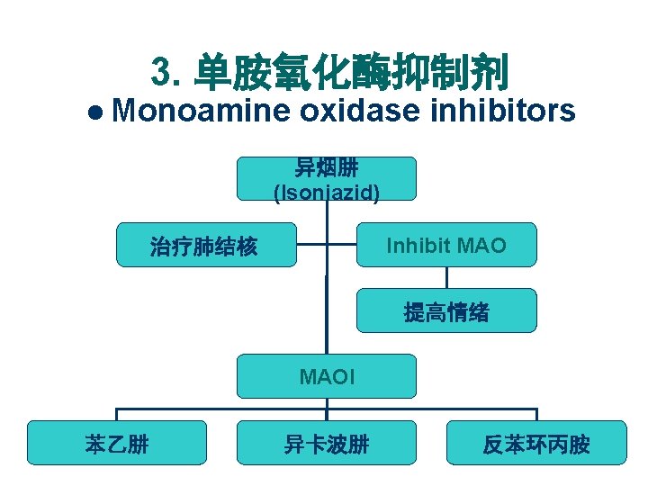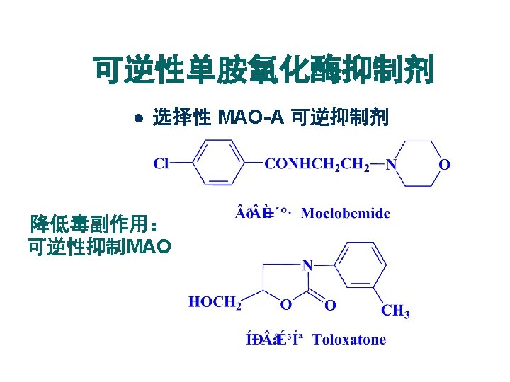 MAOI Phenelzine; Isocarboxazid; Tranylcypromine 这类药物毒副作用较大,应用受限。 Monoamine oxidase inhibitors-2