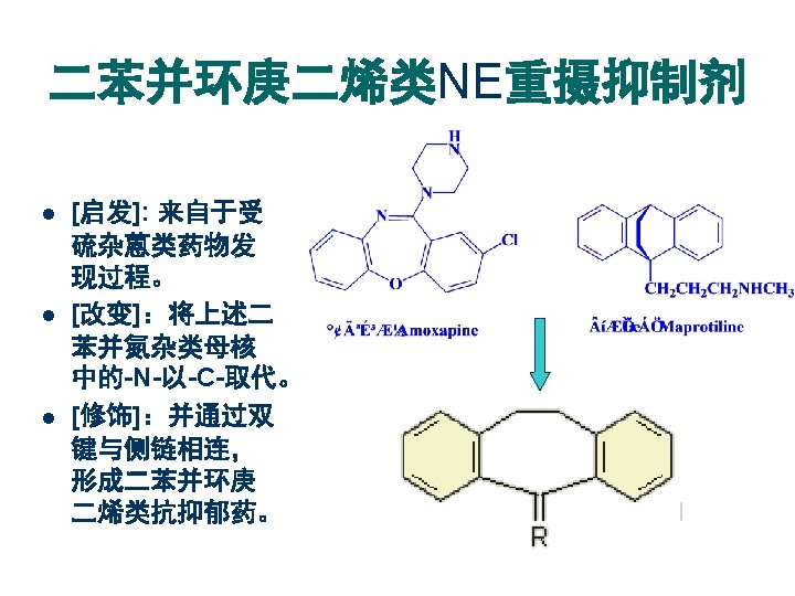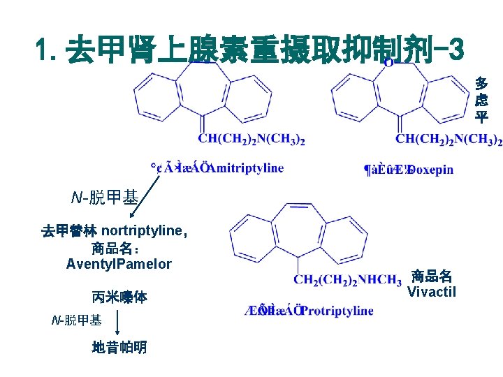 1. 去甲肾上腺素重摄取抑制剂-1 三环类抗抑郁药 R 1 R 2 丙米嗪 Imipramine H (CH 2)3 N(CH 3)2 地昔帕明 Desipramine H (CH 2)3 NHCH 3 氯米帕明 Clomipramine Cl (CH 2)3 N(CH 3)2 曲米帕明 Trimipramine H CH 2 CH(CH 3)CH 2 N(CH 3)2 药名 丙米嗪体内活性代谢产物: 地昔帕明 Imipramine → Desipramine