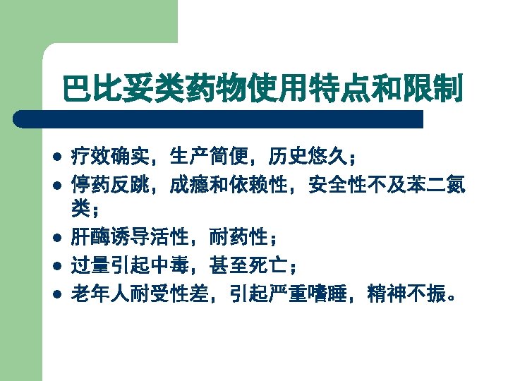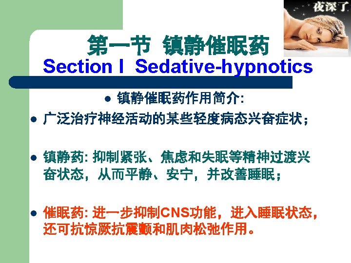 中枢神经抑制剂 CNS Inhibitors l 第一节 镇静催眠药 Sedative-hypnotics l 第二节 抗癫痫药 Antiepileptics l 第三节抗精神失常药(精神障 碍治疗药) Antipsychiatric disorders drugs (Psychotherapeutic Drugs) Sedative -hypnotics CNS Antiepileptics Antipsychotics Common feature