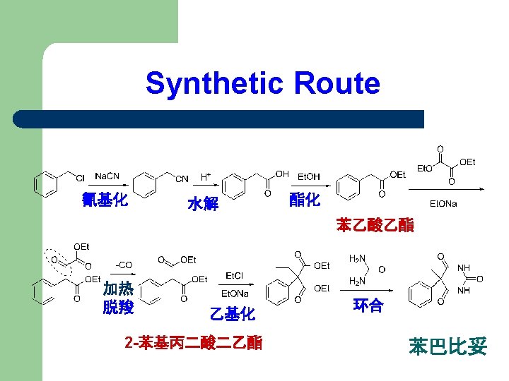 l Raw material analysis: Retro-syn:General route? a. Malonate diethyl ester ; b. Chloro benzene? 直接入苯基亦较难: 须通过苯环上 的亲核取代反应进行,苯环上 无吸电子基时很难发生!