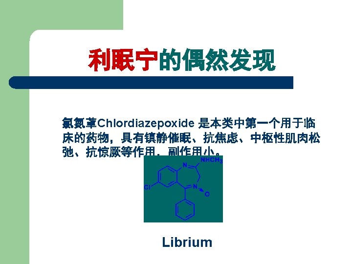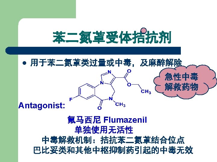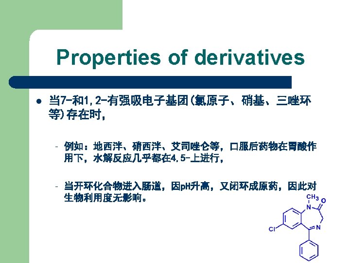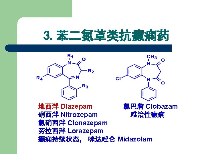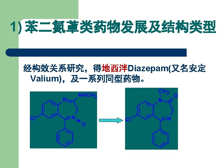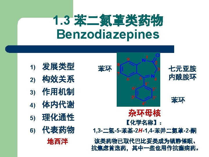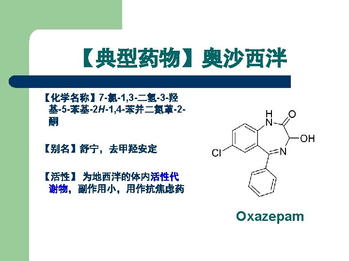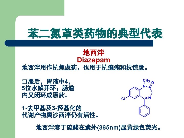 【典型药物】 地西泮 l l l 化学名: 7 -氯-1, 3 -二氢-1 -甲基-5 -苯基 2 H-1, 4 -苯并二氮䓬-2 -酮 7 -Chloro-1, 3 -dihydro-1 methyl-5 -phenyl-2 H-1, 4 benzodiazepin-2 -one Diazepam