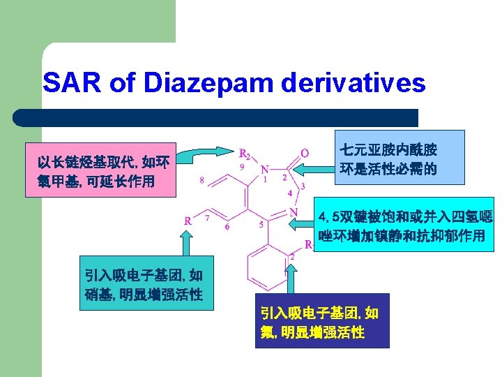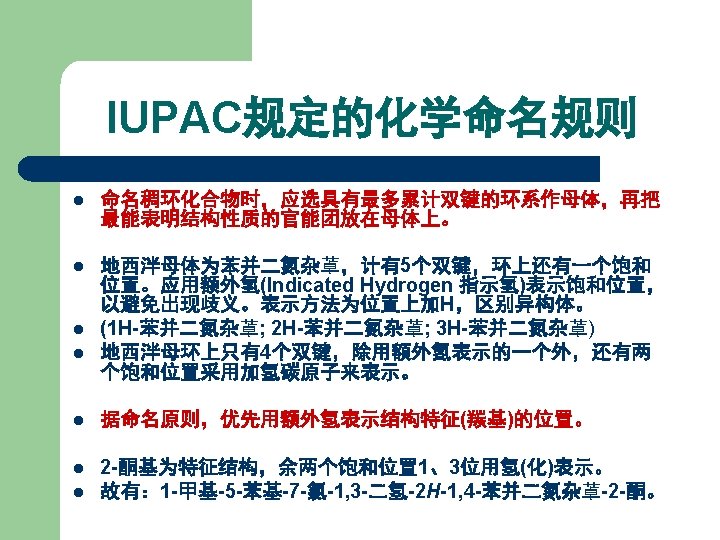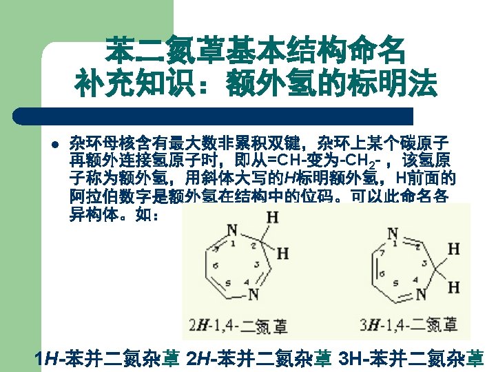 Chemical name of Diazepam 7 -Chloro-1, 3 -dihydro-1 -methyl-5 -phenyl-2 H-1, 4 -benzodiazepin-2 -one 7 -氯-1, 3 -二氢-1 -甲基-5 -苯基-2 H-1, 4 -苯并二氮䓬-2 -酮 3 H- or 1 H-1, 4 -Benzodiazepine 1, 2 -Dihydro-3 H 2, 3 -Dihydro-1 H 1, 3 -Dihydro-2 H- 1, 4 -benzodiazepine