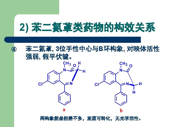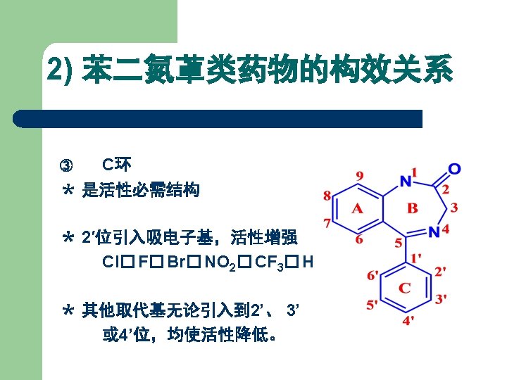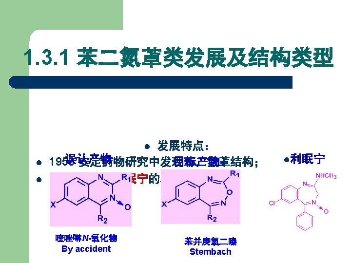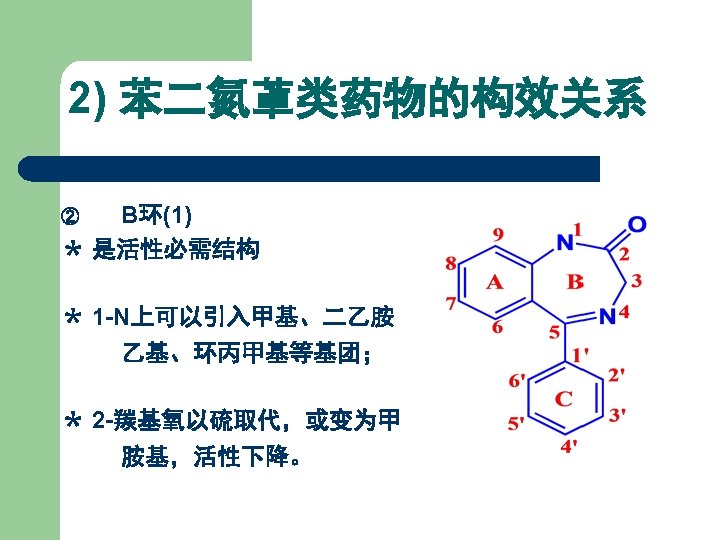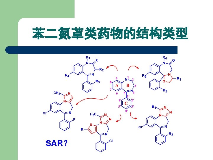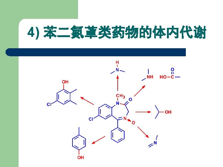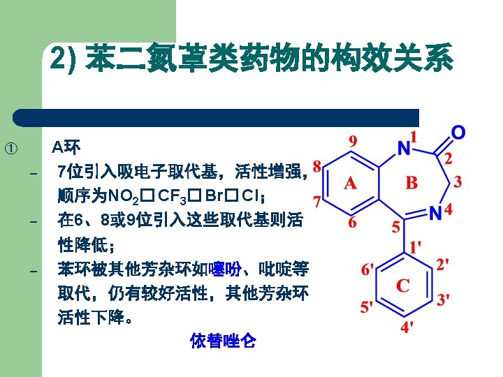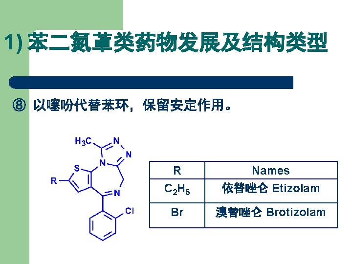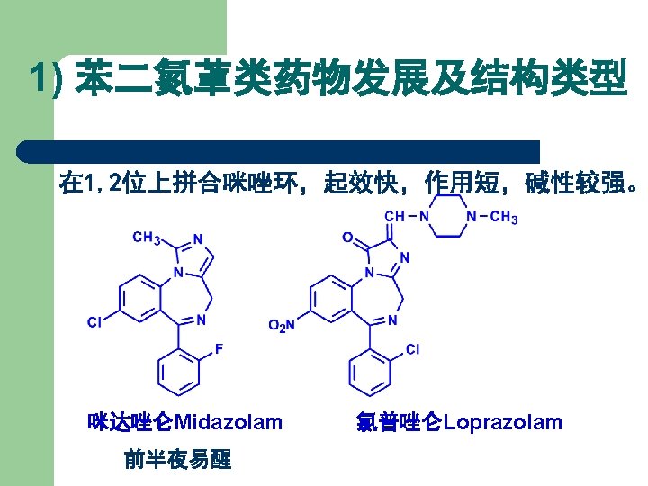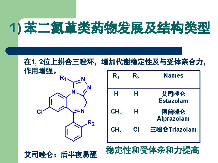 1) 苯二氮䓬类药物发展及结构类型 在 4, 5位上拼合四氢噁唑环,得生物前体药物。 R 1 R 2 R 3 R 4 Names CH 3 H Cl H 噁唑仑 Oxazolam H F Br H 卤噁唑仑 Haloxazolam H Cl Cl H 氯噁唑仑 Cloxazolam CH 3 Cl Cl H 美沙唑仑 Mexazolam Cl CH 2 OH 氟他唑仑 Flutazolam H F