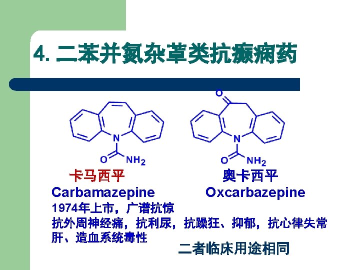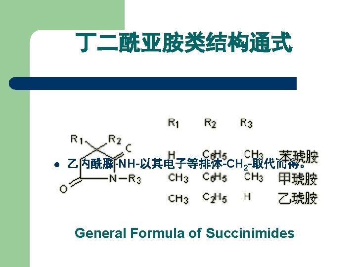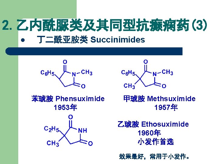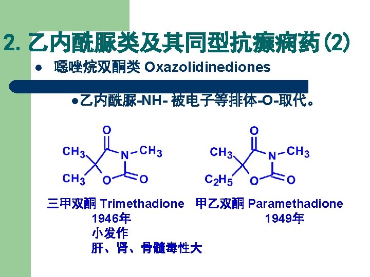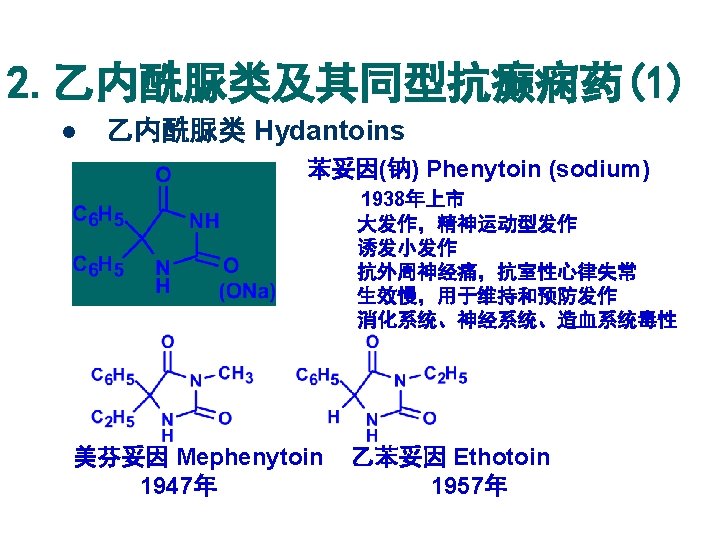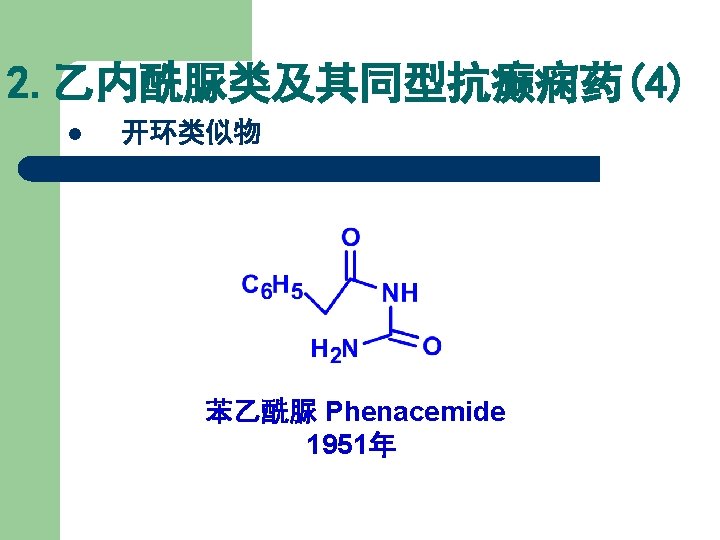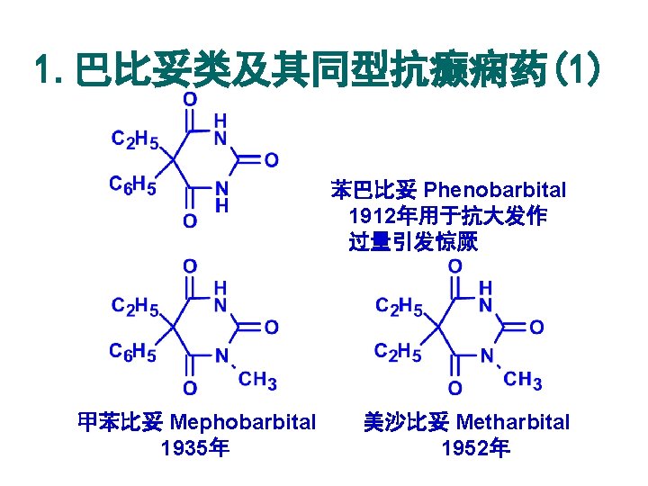 结构类似性总结 结构类型 替换部分X 代表药物 巴比妥类 Bariturates 苯巴比妥 Phenobarbital 乙内酰脲类 Hydantoins 苯妥因钠 Phenytoin sodium 噁唑烷双酮类 Oxazolidinediones 三甲双酮 Trimethadione 丁二酰亚胺类 Succinimides 乙琥胺 Ethosuximide 开环类似物 苯乙酰脲 Phenacemide