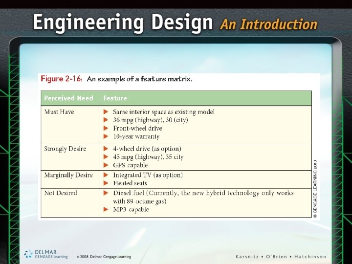 Identifying Criteria and Specifying Constraints • • • Detail what you intend to do Identify imposed limitations Example: new SUV features Study information and make key decisions Write a design brief