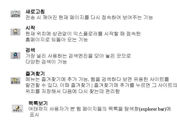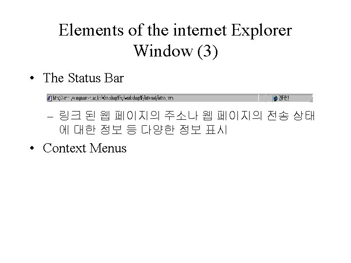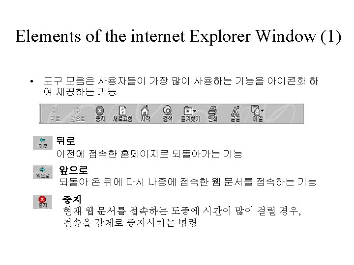 Elements of the internet Explorer Window (2) • The Address Bar – 주소를 입력하면 해당사이트로 이동 • The Link Bar – Web page들에 연결된 icon들로 구성 – 추가, 삭제 가능 • The Explorer Bar – IE window의 왼쪽 편에 Search, History, Favorites나 Channel을 보여 준다. • The Viewing Window