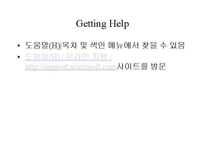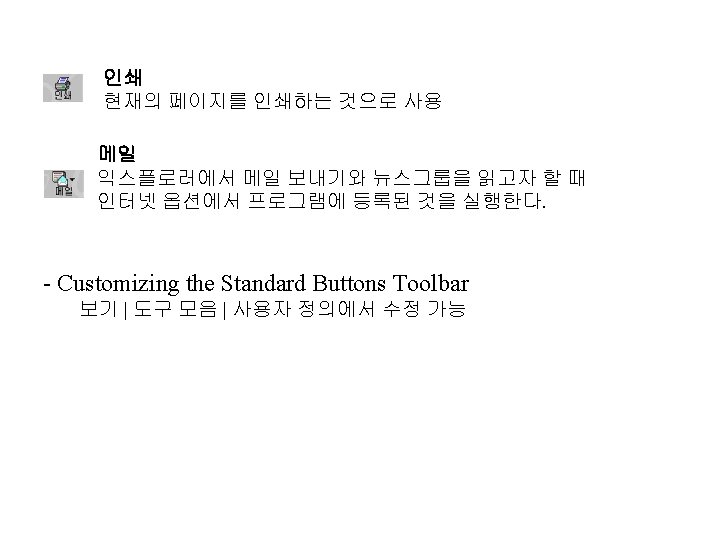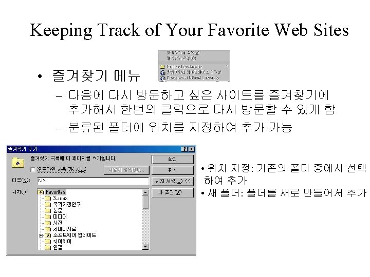 Viewing Pages in Internet Explorer • Opening a Page – 파일 | 열기, address bar, 다른 페이지의 link 선택, history folder, 즐겨찾기 등 이용 • Editing a Page : default HTML-editing application • Viewing HTML Source Code : 보기 | 소스 • Printing and Saving Pages – Printing : 파일 | 인쇄, PRINT button • 프레임이 있는 페이지에서는 옵션 선택 – Saving : 파일 | 다른 이름으로 저장 • 모든 웹 페이지, 웹 페이지 중 HTML 만, 텍스트 파일