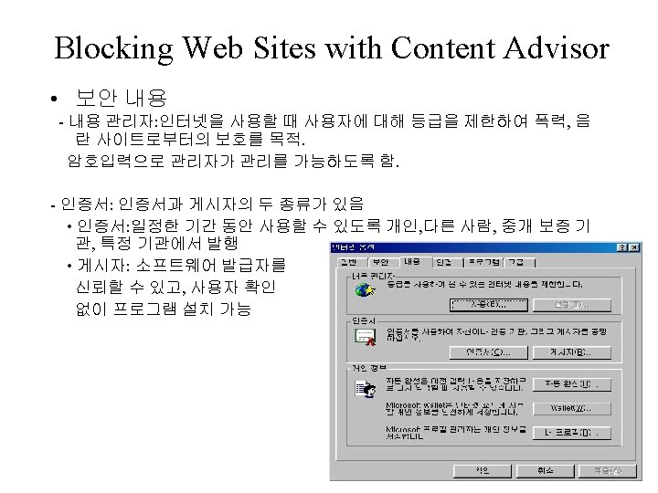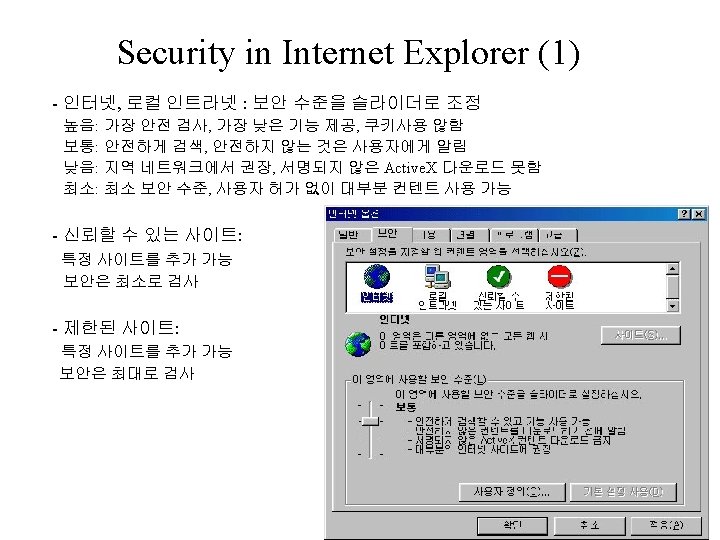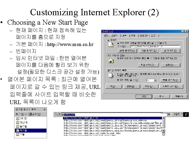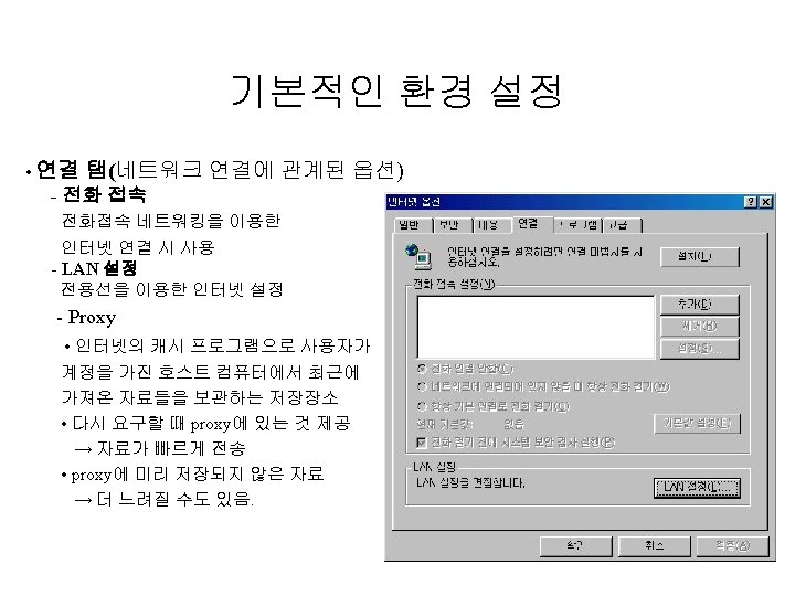 Acquiring and Installing Internet Explorer • Microsoft Internet Explorer 구하기 – Microsoft 홈페이지 : http: //www. microsoft. com/windows/ie/default. htm – Unix, HP Unix, Macintosh, Windows 버전이 있음 • 설치 – setup. exe 실행 – proxy server를 이용할 때는 도구 | 인터넷 옵션에서 연결 탭의 LAN 설정에서 지정