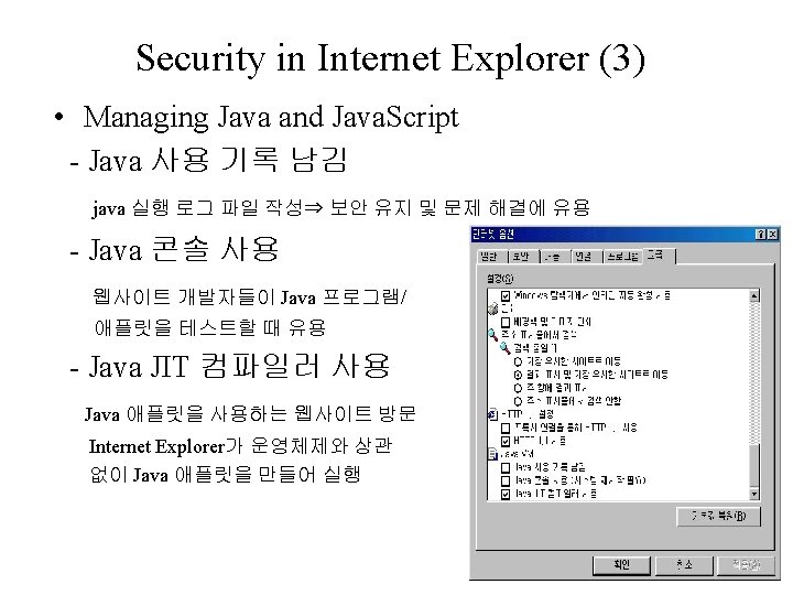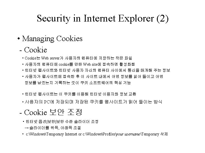 Index • • Acquiring and Installing Internet Explorer 기본적인 환경 설정 Internet Explorer의 화면 구성 Viewing Pages in Internet Explorer Keeping Track of Your Favorite Web Sites Customizing Internet Explorer Security in Internet Explorer Getting Help