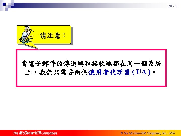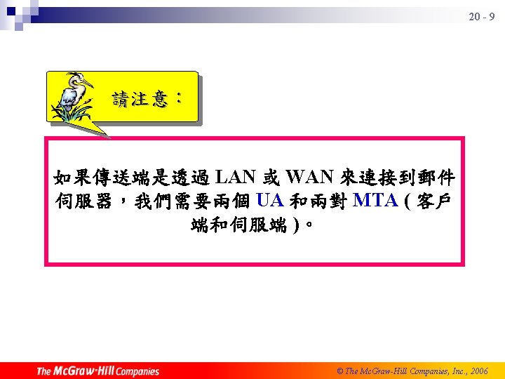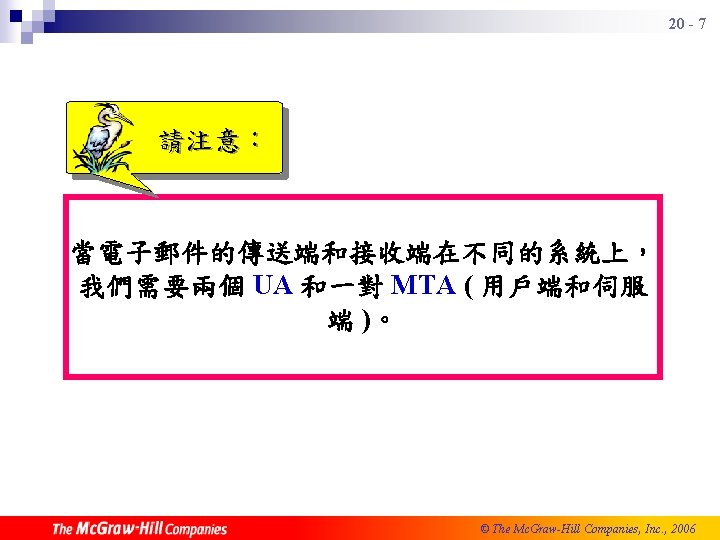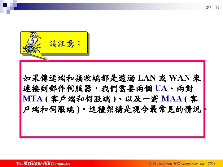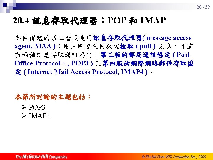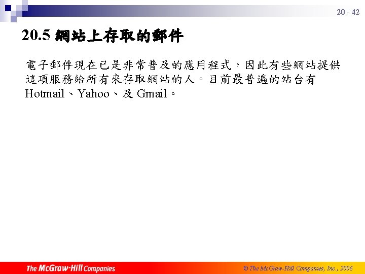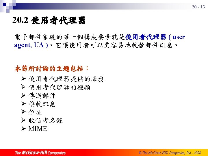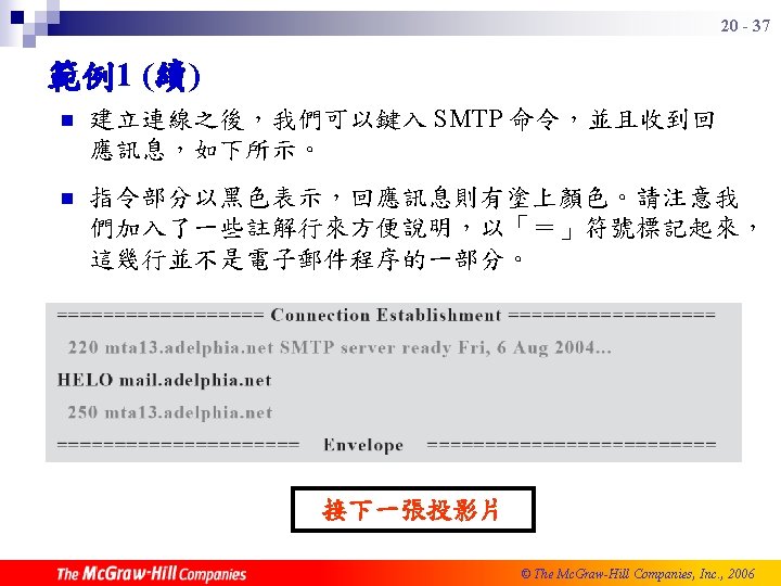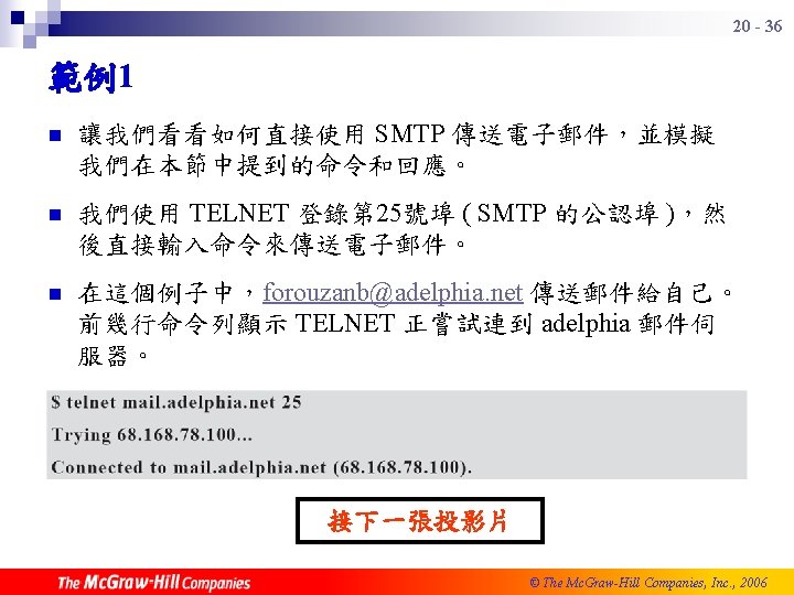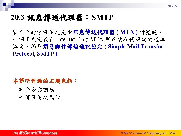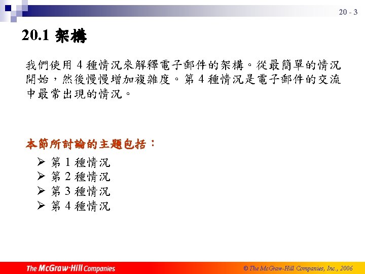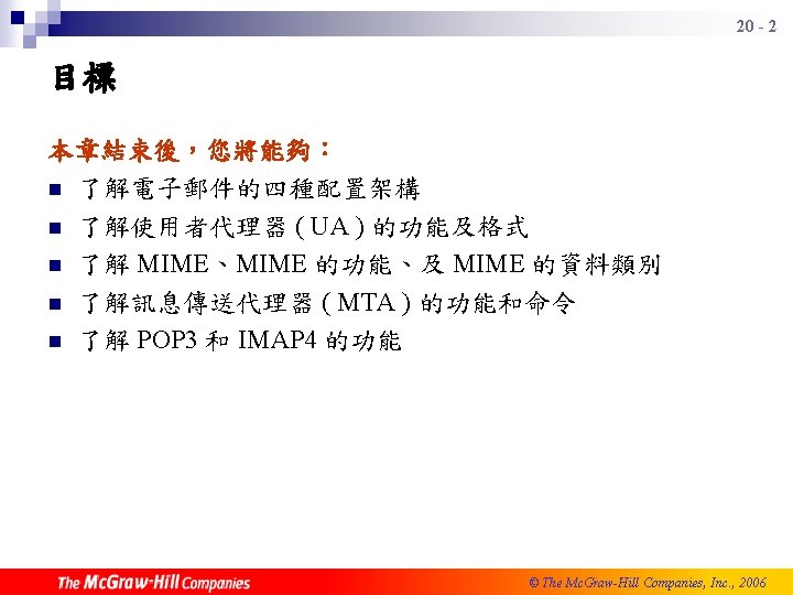 Chapter 20 SMTPPOP IMAP The Mc GrawHill Companies Slides: 42 Download presentation Chapter 20 電子郵件: SMTP、POP 和 IMAP © The Mc. Graw-Hill Companies, Inc. , 2006 20 - 4 © The Mc. Graw-Hill Companies, Inc. , 2006 20 - 6 © The Mc. Graw-Hill Companies, Inc. , 2006 20 - 8 © The Mc. Graw-Hill Companies, Inc. , 2006 20 - 10 © The Mc. Graw-Hill Companies, Inc. , 2006 20 - 11 © The Mc. Graw-Hill Companies, Inc. , 2006 20 - 14 © The Mc. Graw-Hill Companies, Inc. , 2006 20 - 15 請注意: 命令列模式之UA 的一些例子有mail、pine和 elm。 © The Mc. Graw-Hill Companies, Inc. , 2006 20 - 16 請注意: GUI 模式之UA的一些例子有Eudora、Netscape、 和微軟的Outlook。 © The Mc. Graw-Hill Companies, Inc. , 2006 20 - 17 © The Mc. Graw-Hill Companies, Inc. , 2006 20 - 18 © The Mc. Graw-Hill Companies, Inc. , 2006 20 - 19 © The Mc. Graw-Hill Companies, Inc. , 2006 20 - 20 © The Mc. Graw-Hill Companies, Inc. , 2006 20 - 21 © The Mc. Graw-Hill Companies, Inc. , 2006 20 - 22 © The Mc. Graw-Hill Companies, Inc. , 2006 20 - 23 © The Mc. Graw-Hill Companies, Inc. , 2006 20 - 24 © The Mc. Graw-Hill Companies, Inc. , 2006 20 - 25 © The Mc. Graw-Hill Companies, Inc. , 2006 20 - 27 © The Mc. Graw-Hill Companies, Inc. , 2006 20 - 28 © The Mc. Graw-Hill Companies, Inc. , 2006 20 - 29 © The Mc. Graw-Hill Companies, Inc. , 2006 20 - 30 © The Mc. Graw-Hill Companies, Inc. , 2006 20 - 31 © The Mc. Graw-Hill Companies, Inc. , 2006 20 - 32 © The Mc. Graw-Hill Companies, Inc. , 2006 20 - 33 © The Mc. Graw-Hill Companies, Inc. , 2006 20 - 34 © The Mc. Graw-Hill Companies, Inc. , 2006 20 - 35 © The Mc. Graw-Hill Companies, Inc. , 2006 20 - 38 範例1 (續) © The Mc. Graw-Hill Companies, Inc. , 2006 20 - 40 © The Mc. Graw-Hill Companies, Inc. , 2006 20 - 41 © The Mc. Graw-Hill Companies, Inc. , 2006