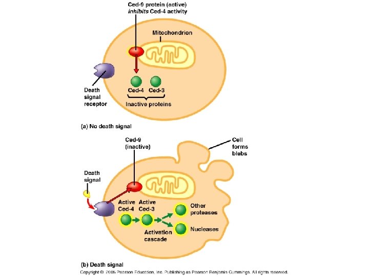 Apoptosis F Apoptosis is the programmed cell death that occurs through the normal course of development. F It is usually triggered by signals that activate a cascade of signal proteins in cells that are to die. F During the process, the cell shrinks, the nucleus breaks down and the nearby cells quickly engulf and break down the contents of the cell.