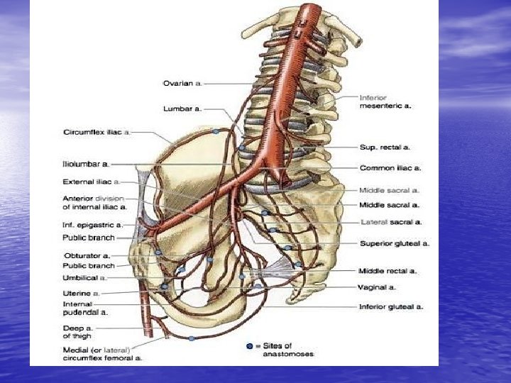 BLOOD SUPPLY AND NERVES • NERVES: lumbar plexus, 4 th and 5 th lumbar nerves, 1 -3 sacral nerves, sciatic nerves, tibial and common peroneal nerves • BLOOD: Arteries: 2 common iliac arteries, internal and external iliac arteries • Veins: 3 major: found in the hip, groin and pelvis. Common iliac vein, internal iliac vein and external iliac vein