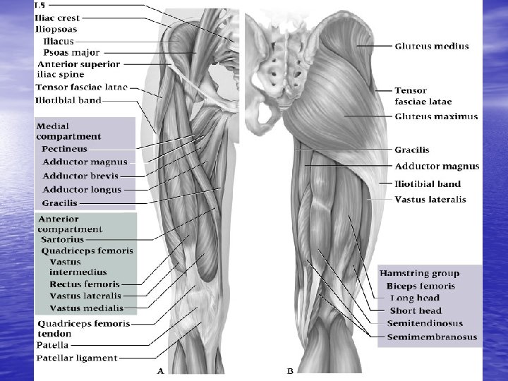 PALPATION • SOFT TISSUE: - ANTERIOR: sartorius, Quad - POSTERIOR: Hamstring - MEDIAL: Adductors - LATERAL: Abuctors, Iliotibial band (ITB), Gluteus medius and tensor fasciae latae
