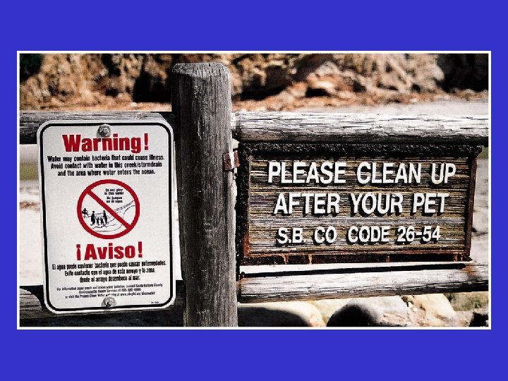 • Largest outbreak in US history – Cryptosporidium – Gastrointestinal parasite that causes flu like symptoms • Fecal Coliform – Intestinal bacteria – we use fecal coliform bacteria as a standard measure and indicator of disease potential – Indicates that fecal matter is present • Normal constituent of human and animal intestines