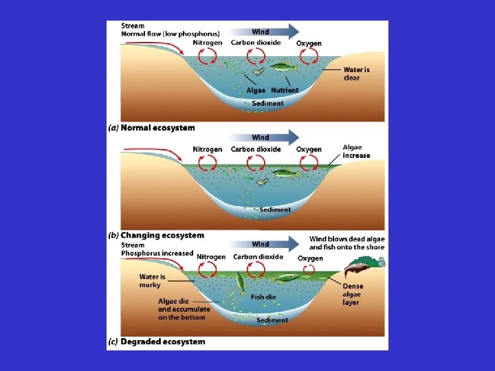 Eutrophication • Oligotrophic lake (BOD is low) – Lake w/ relatively low concentration of chemical elements required by life – Clear water – Low abundance of life – animals are diverse (mosquitos, fish, aquatic insects and bugs) • Eutrophic lake - (BOD is high) – Lake w/ high concentration of chemical elements – Often w/ mats of algae and murky water – Abundance of life, but few animals – only algae, bacteria, and some other higher plant species