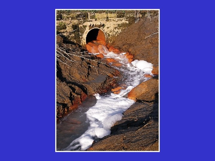 Acid Mine Drainage • Refers to water w/ a high concentration of sulfuric acid that drains from mines. – Coal mines often associated w/ pyrite (iron sulfide) – When it come into contact w/ oxygen and water it weathers – A product of weathering is sulfuric acid – Water runs through the mine tailings