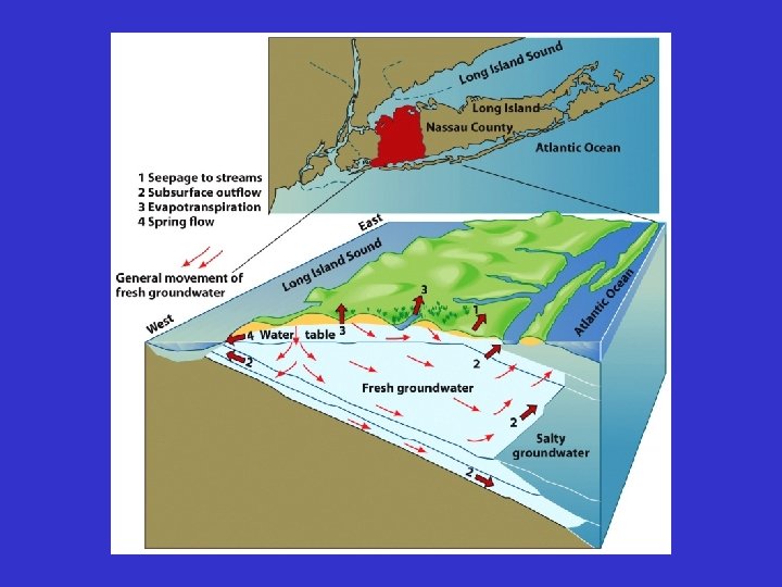 Long Island, New York • Two counties in Long Island (Nassau and Suffolk) depend entirely on groundwater • Two major problems in Nassau: – Intrusion of salt water and shallow aquifer contamination