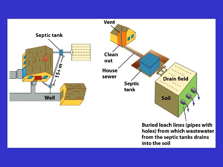 Septic-Tank Disposal Systems • Common in many rural areas and outlying areas of cities. • Basic parts of a septic-tank disposal system – Sewer line from house to underground tank – Tank separates solids from liquids • Digest and store solids • Liquid sent to absorption field – By the time water reaches any fresh water it “should” be safe.