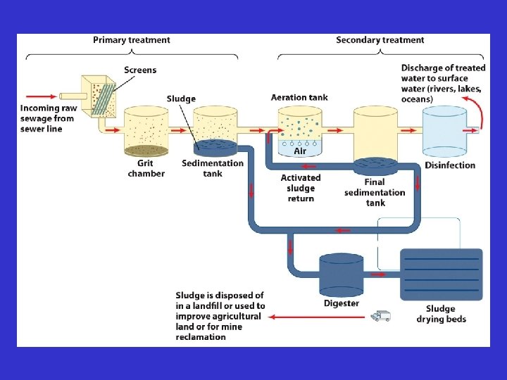 Secondary Treatment • Secondary treatment removes ~90% of BOD • Sludge from the digester is dried and disposed of in a landfill or applied to improve soil.