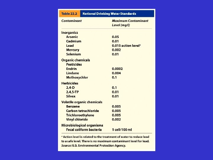 Water Pollution • Increasing population often results in the introduction of more pollutants. – As well as demands on finite water resources – ~36 million people in US supplied w/ water from systems that violated federal standards. • EPA sets thresholds and limits on some but not all pollutants – 700 identified drinking water contaminants