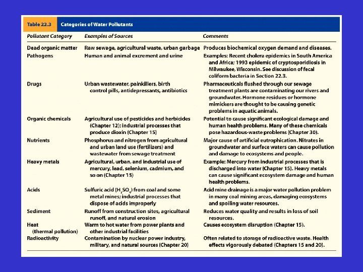 Water Pollution • Water pollutants includes – – – – Heavy metals Sediment Certain radioactive isotopes Heat Fecal coliform bacteria Phosphorus Nitrogen Pathogenic bacteria and viruses