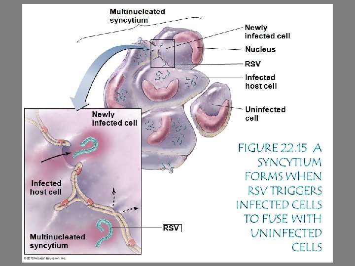 Respiratory Syncytial Virus (RSV) Infection Most common childhood respiratory disease Signs and symptoms ○ Fever, runny nose, and coughing in babies or immunocompromised individuals ○ Mild coldlike symptoms in older children and adults Pathogen ○ Respiratory syncytial virus (RSV) Pathogenesis ○ Virus causes syncytia to form in the lungs Giant, multi-nucleated cell formed from fusion of virally infected cells with neighboring cells ○ Immune response to RSV further damages the lungs © 2012 Pearson Education Inc.