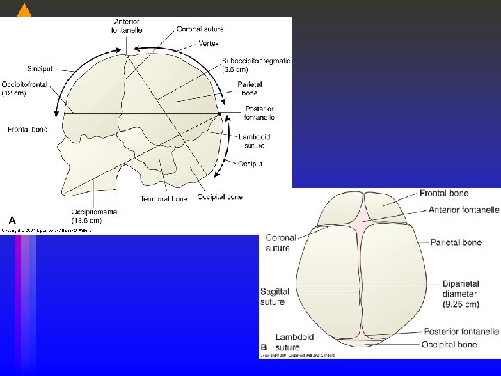 Passenger • The fetus: head is largest diameter • Fetal head: 4 bones with 3 membranous interspaces (sutures) that allow bones to move & overlap to diminish size of skull • Molding: head becomes narrower, longer, sutures can overlap--normal--resolves 1 -2 days after birth • Fontanelles: at junctures of skull bones