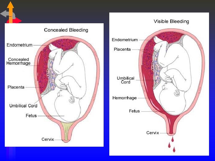 Abruptio Placentae • Premature separation of placenta from uterine wall • S/S: sharp, stabbing pain high in fundus, heavy bleeding (may be occult), hard, board-like uterus, tense, painful uterus, signs of shock due to blood loss, Port-Wine aminotic fluid if ROM. • Predisposing fx: ↑parity, adv. maternal age, short umbilical cord, chronic HTN, PIH, direct trauma, vasoconstriction from cocaine or cigarette use • Fetal distress on monitor. Can progress to DIC.