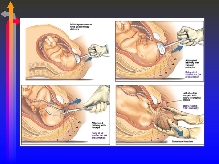Operative Assisted Deliveries • Forceps • Indications: unable to push, arrested descent, need a quick delivery, breech • Associated with: maternal/fetal birth trauma, rectal sphincter tear, urinary stress incontinence • Vacuum extraction • Advantages: fewer lacerations, less anesthesia needed, • Disadvantages: marked caput, cephalhematomas, scalp laceration/bruising