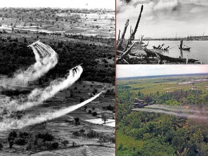 Planes spraying Agent Orange defoliant on Vietnam in 1966. Over 100, 000 tons of herbicides (Agents Blue, Orange, Pink, Purple and White) were dropped on Vietnam in attempt to deprive Viet Cong of food and forest cover. New study shows 2 to 4 million people were sprayed directly with the chemicals which contained concentrations of dioxin more than 100 times greater than normal. In additional to killing many thousands, U. S. chemical warfare left legacy of half a million Vietnamese children suffering from birth defects, according to the Wall Street Journal.