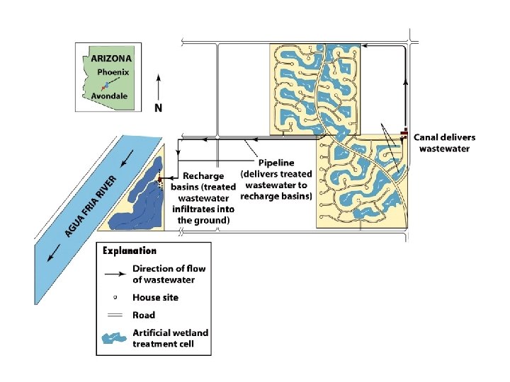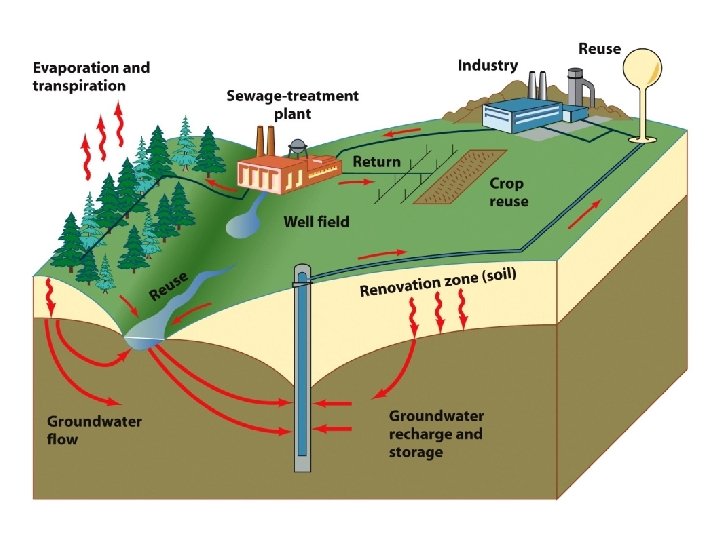 Wastewater Renovation and Conservation Cycle • Steps: – 1. Return of treated wastewater to crops – 2. Renovation or natural purification by slow percolation of the wastewater into soil to eventually recharge the groundwater resource with clean water – 3. Reuse of the treated water