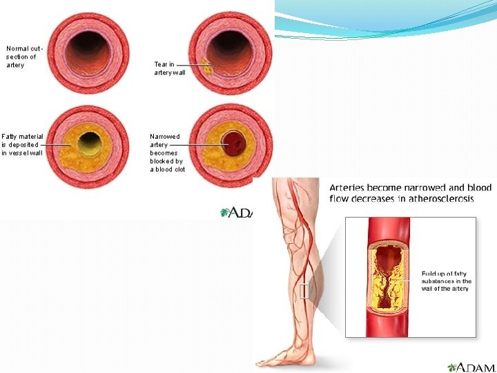Atherosclerosis �Disease in which fatty substances, including cholesterol build up inside artery walls. �These deposits, called plaque, cause the artery walls to thicken and narrow. �Narrowed vessels make it harder for blood to flow. �Saturated fats can increase the risk of atherosclerosis. �Can also increase your risk of developing other cardiovascular diseases.