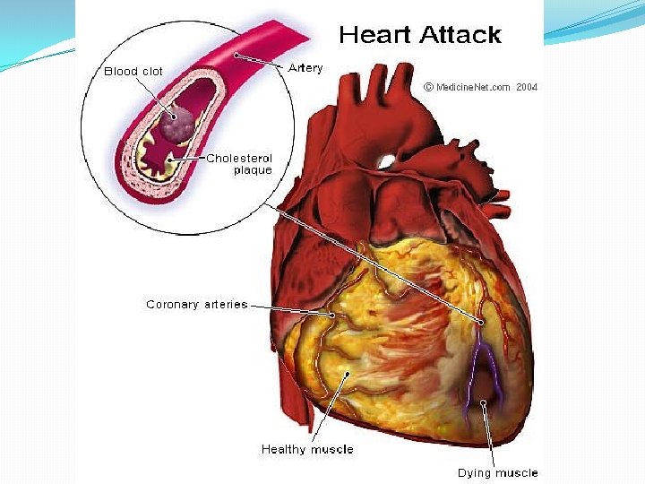 Heart Attack �Occurs when some of the tissue in the heart doesn’t receive its normal blood supply and dies. �Usually caused by a blood clot that forms in the coronary artery. �The more heart tissue that dies, the more severe the heart attack.