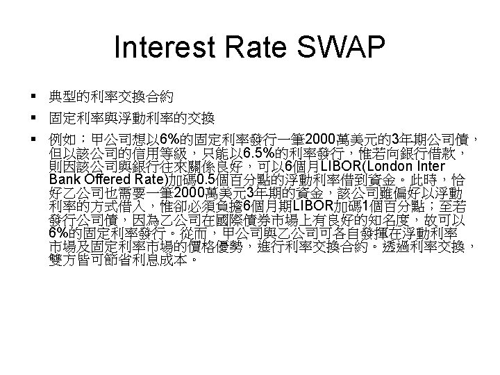 Interest Rate SWAP • For Big Boy – if he borrows the debt with fixed rate, then he can add a benefit of 2% – if he borrows the debt with floating rate, then he can add a benefit of 0. 5% • For Little Guy, – if he borrows the debt with fixed rate, then he can add a benefit of -2% – if he borrows the debt with floating rate, then he can add a benefit of -0. 5%
