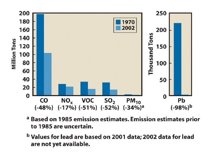 Major Air Pollutants • • • Pg. 528 to end of chapter. Sulfur Dioxide (acid rain) – industrial & refining Nitrogen Oxide – burning fossil fuels Carbon Monoxide – fires, cars, furnaces Ozone and Other Photochemical Oxidants – cars, fossil fuel burning Volatile Organic Compounds - solvents Particulate Matter – burning fossil fuels Hydrogen Sulfide – smelting (and natural) Hydrogen Fluoride – burning coal, making aluminum Lead – burning gasoline (not in US)