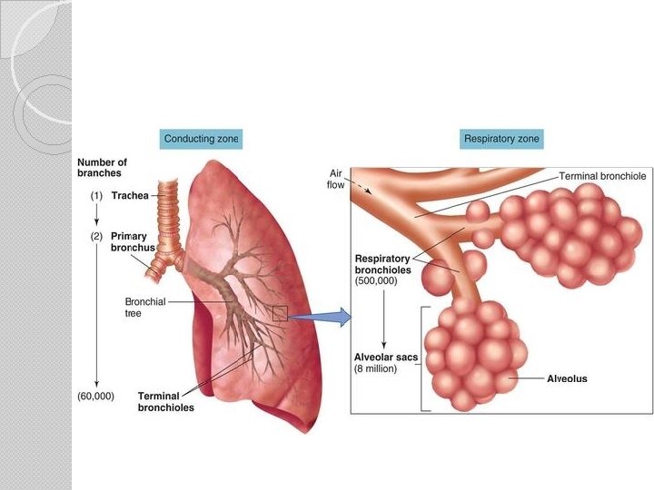 �respiratory system is a series of airways that start with the nose and mouth and end at the alveoli in the lungs �respiratory system is divided into: ◦ upper respiratory tract: nose, sinuses, nasopharynx, tonsils, eustachian tubes and larynx(fig 24 -2 p. 301) ◦ lower respiratory tract: larynx, trachea, bronchioles, alveoli (fig 24 -3, p. 302)
