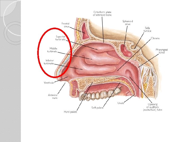 Respiratory System: Structure and Function: (Box 24 -1 pg. 300 -301) � respiratory system brings oxygen (O 2) into lungs and removes carbon dioxide (CO 2) � air enters body through nose � nose and it’s structures serve 2 functions: ◦ olfactory (smell): upper part of each nostril, cells contain microscopic hairs that react to odors in the air. Hairs stimulate olfactory cells, send signal to brain where sense of smell is processed ◦ respiratory: the nose warms, humidifies, and filters inhaled air, both nasal passages have folds of skin called turbinates. These folds increase the amount of nasal tissue. Turbinate tissue contains many blood vessels, and are lined with membranes. Blood circulating through these membranes warms and humidifies the inhaled air
