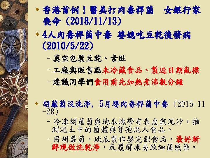 The Adult Botulism Syndrome: Incidence and Vehicle Foods w Symptoms of botulism may develop anywhere between 12 and 72 hours after the ingestion of toxin-containing foods. w Symptoms consist of nausea, vomiting, fatigue (疲勞), dizziness (頭昏眼花) , and headache; dryness of skin, mouth, and throat; constipation (便秘), lack of fever, paralysis ( 麻痺) of muscles, double vision, and, finally, respiratory failure and death.