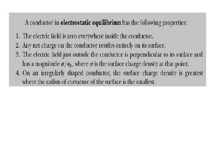 • A good electrical conductor contains charges (electrons) that are not bound to any atom and therefore are free to move about within the material. • When there is no net motion of charge within a conductor, the conductor is in electrostatic equilibrium that has the following properties: . 1. The electric field is zero everywhere inside the conductor. 2. If an isolated conductor carries a charge, the charge resides on its surface. 3. The electric field just outside a charged conductor is perpendicular to the surface of the conductor and has a magnitude σ/ε 0 , where is the surface charge density at that point. 4. On an irregularly shaped conductor, the surface charge density is greatest at locations where the radius of curvature of the surface is smallest.