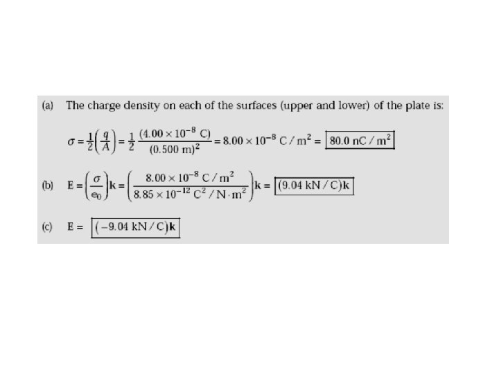 Q 37: A large flat sheet of charge has a charge per unit area of 9. 00 u. C/m 2. Find the electric field just above the surface of the sheet, measured from its midpoint.
