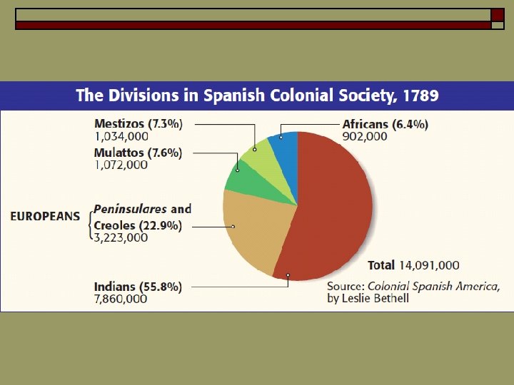 Colonial Society Divided o A Race and Class System n Latin America has social classes that determine jobs and authority o Peninsulares - Born in Spain, they head colonial government, society o Creoles - American-born Spaniards who can become army officers o Mestizos - have both European and Indian ancestry o Mulattos – have both European and African ancestry o Slaves, Indians are at the bottom of society