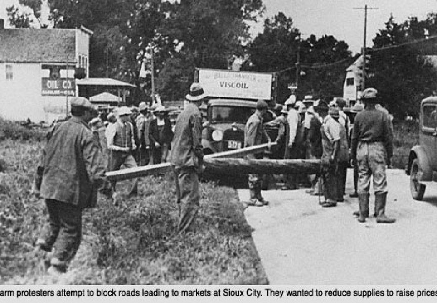 Farmers upset about low crop prices and bank foreclosures *try to keep crops from market *disrupt farm auctions