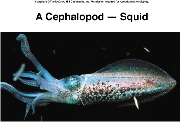 Classifying Mollusks Further 2. Class Cephalopoda – “head foot” – High degree of CEPHALIZATION – Octopi, Squid, Nautilus, Cuttlefish – Tentacled and highly motile, with excellent senses, particularly the eyes – Originated 500 million years ago, in Cambrian Period – No shell, but internal shell is present – Jet propulsion – Ink defense mechanism, Poisonous radula – ewww!