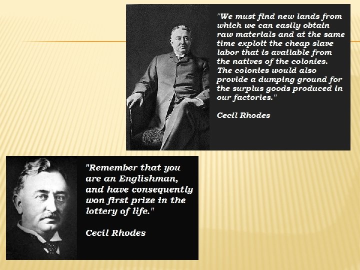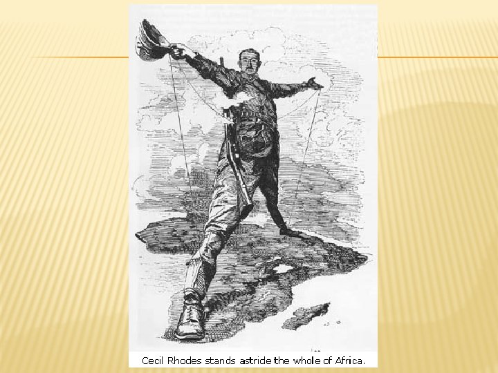DIAMONDS Southern Africa = El Dorado of Africa � 1868: Kimberley annexed by GB � Angered Afrikaans � Confronted and defeated Xhosa and Zulu � � Transvaal and Orange Free State South African War � GB crushed Afrikaans � � Cecil Rhodes Wanted to “annex the stars” � Founded De Beers Consolidated � � STILL leading producer of diamonds � Northern and Southern Rhodesia (Zambia and Zimbabwe)