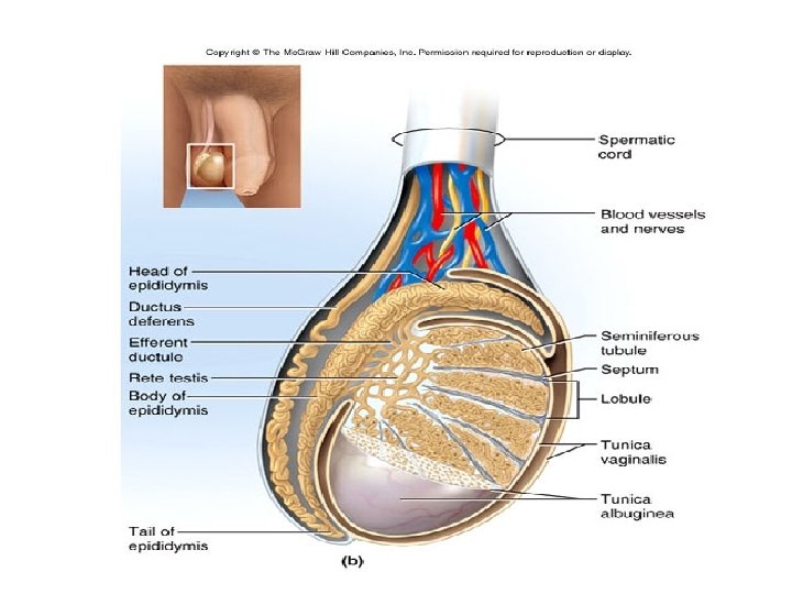 Testes Development • Gubernaculum testis connective tissue fibers extends from testis to peritoneum locking testes in position • Vaginal process – fold of the peritoneum forms a sac = tunica vaginalis that LINES SCROTAL CAVITY; reduces friction between scrotal-sac and testes. § Inguinal canal – gubernaculum and vaginal process create pathway allowing testes to moved into scrotal sac. • Tunica albuginea - dense connective tissue capsule surrounding testes; forms septa that divides testes into a series of 200 -300 compartments =lobules (within by tunica vaginalis) • Seminiferous tubules – 1/2 mile of long, tiny coiled tubes packed inside lobules/ testes where spermatogenesis occurs through entire length of tubule. Forms a loop connected to rete testis, a network of passageways; in the rete testis sperm become CONCENTRATED. Unconcentrated sperm entering the epididymis could result in possible infertility. • Developing germ cells begin their development near the periphery of the tubules get released as spermatozoa in the lumen of the tubule