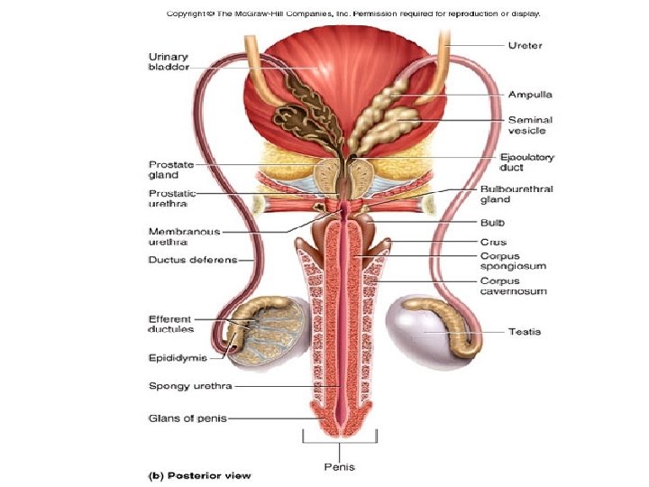 Penis http: //getanchorednow. com/yahoo_site_admin/assets/images/penisdiagram. 17851350_std. gif • Common passage for urine and semen • Three cylindrical bodies of tissue which protect urethra and fill with blood during sexual arousal accounting for its enlargement and erection • 1) corpus spongiosum – a mid-ventral, sinus rich NON-erectile tissue that wraps around the spongy urethra. Forms bulb to anchor the penis to the abdomen; prevents compression of urethra during erection. • Expands at the tip of the penis to form glans penis (more sensitive area of the penis) which is covered by prepuce- the foreskin. • Preputial glands secrete waxy material (smegma) that can support bacterial growth. Circumcision, surgical removal of prepuce, can help prevent infection – 2) corpora cavernosa - two dorso-lateral, capillary sinus-rich masses of erectile tissues. Injury can cause fracture and rupture of tissue.