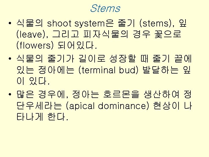 Plant Organs: Roots, Stems, and Leaves • 식물체는 a root system and a shoot system으로 구성되며, 각각은 서로 의존한다.