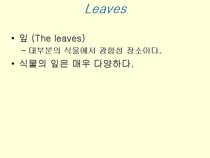 • Stomata, tiny pores that allow gas exchange – Occur in the epidermis of leaves • The mesophyll – Is the ground tissue system in a leaf