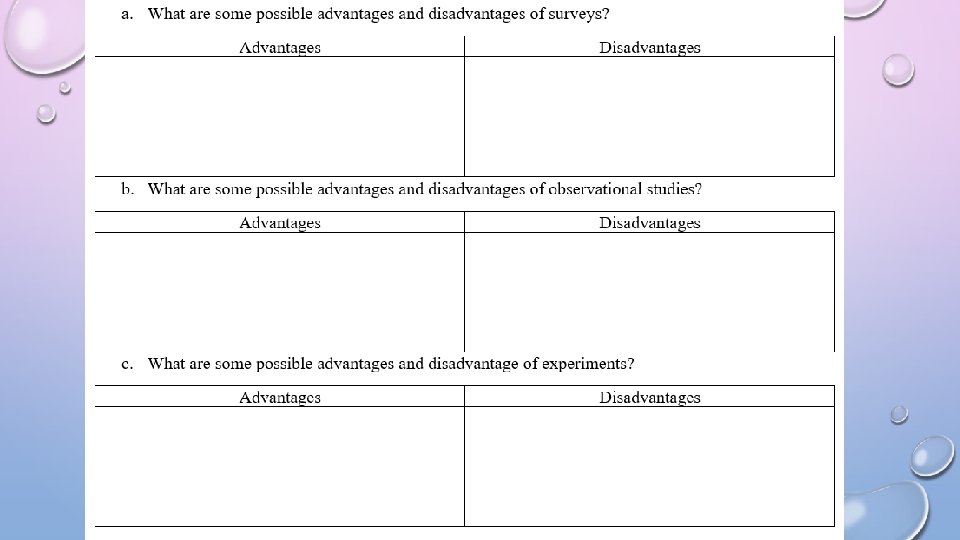 PROS AND CONS TO SURVEYS A FEW PROS TO SURVEYS A FEW CONS TO SURVEYS • GENERALLY QUICK FOR PARTICIPANT • SURVEYOR BIAS • EASY TO COLLECT DATA • HONESTY • CATEGORICAL DATA – EASY TO DISPLAY IN BAR GRAPH OR PIE CHART • LACK OF DEPTH